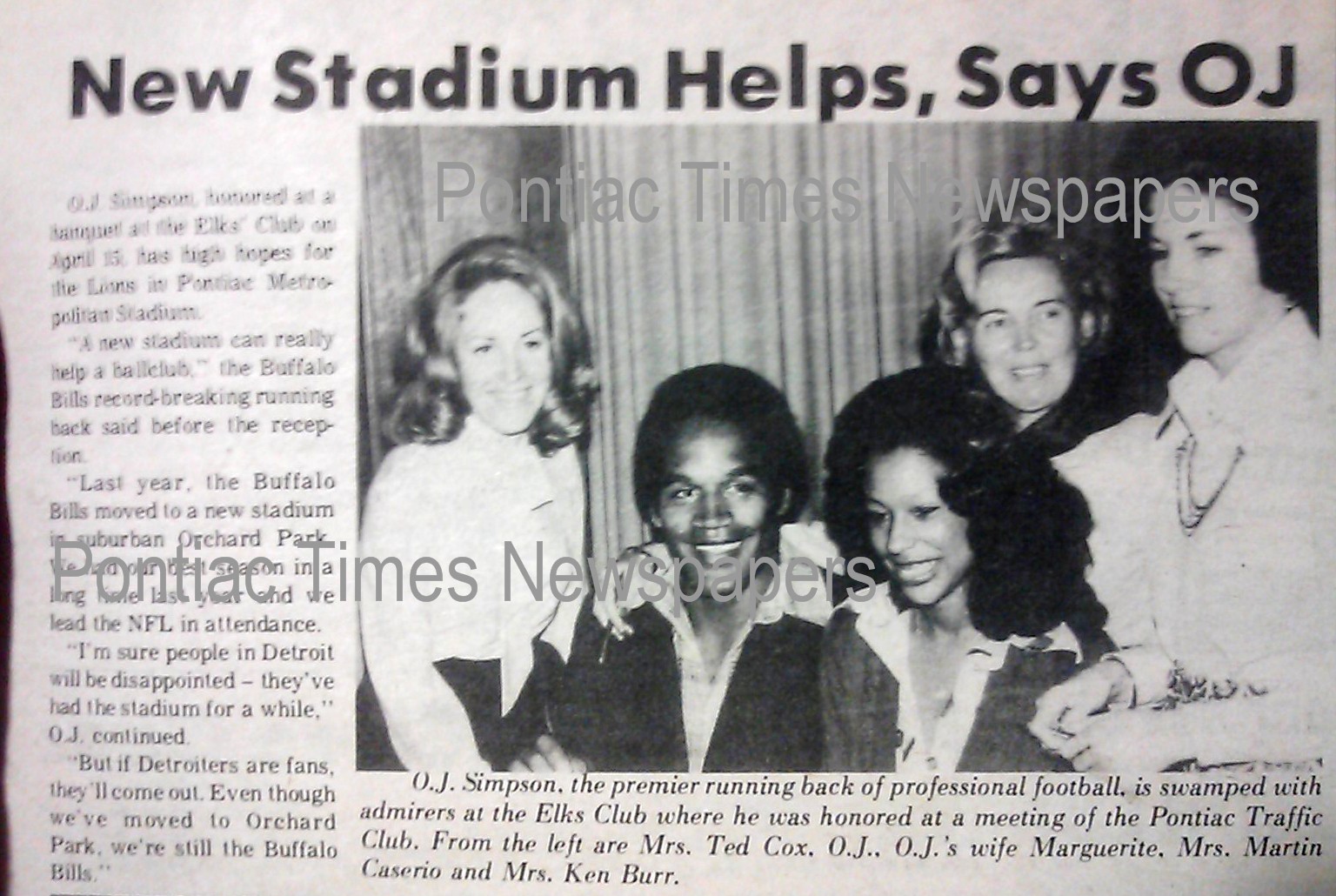 On April 15, 1974, football star O.J. Simpson along with his first wife Marguerite, made an appearance in Pontiac MI. on behalf of Buffalo Bills owner, resident and local business owner, Ralph Wilson. (see below)
